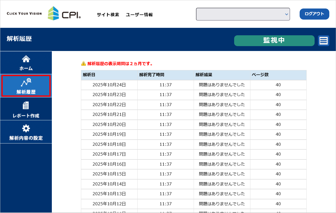 解析日、解析完了時間、解析結果、ページ数を確認できます。