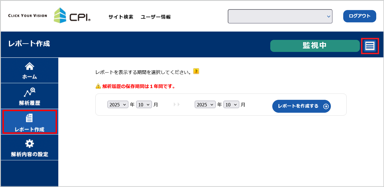 Dashboad 右上の 3 本線のアイコンをクリックし、次の画面で「レポート作成」をクリックします。