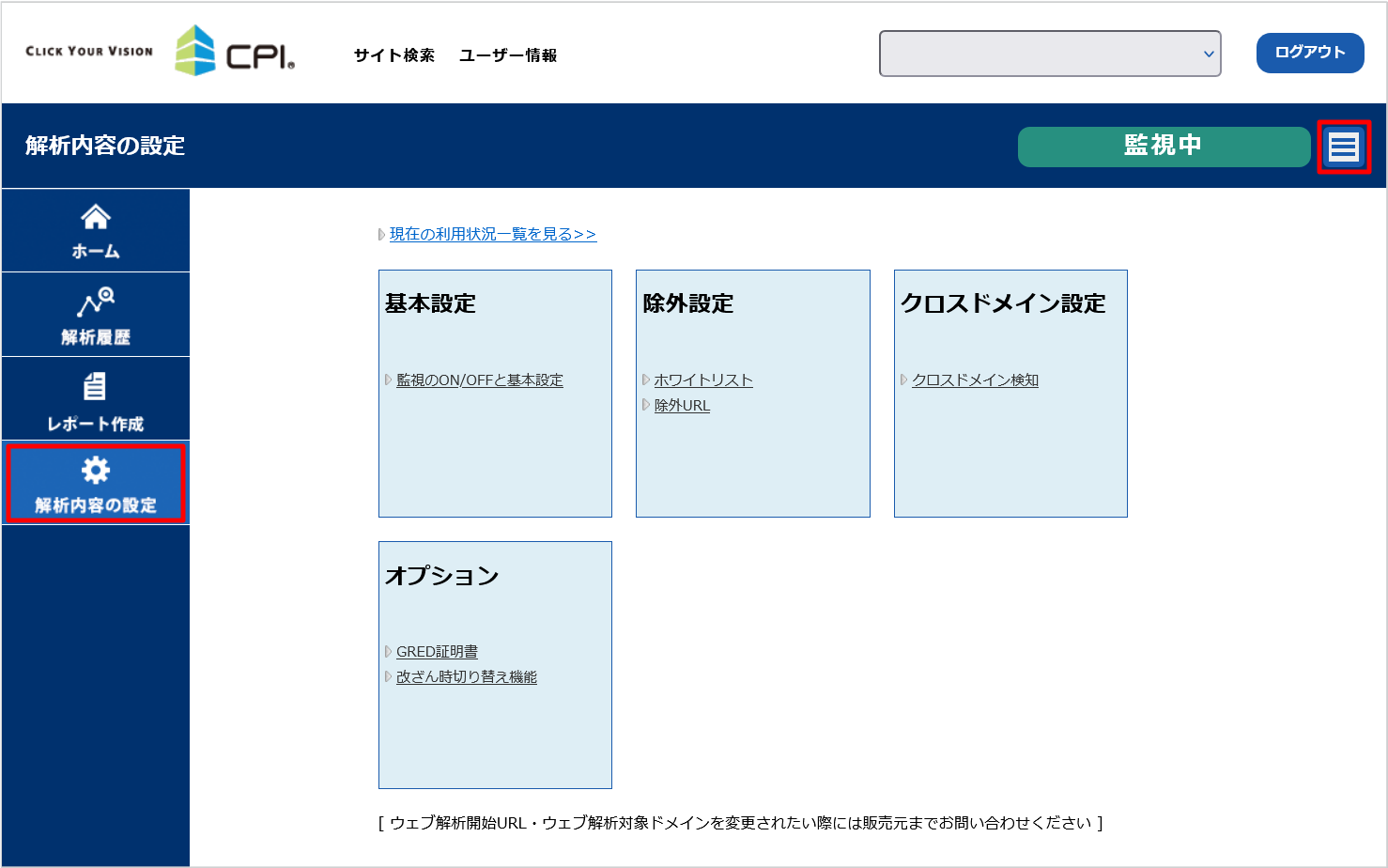 Dashboad 右上の 3 本線のアイコンをクリックし、次の画面で「解析内容の設定」をクリックします。