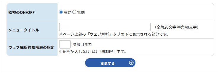 メニュータイトル(全角 20 文字 半角 40 文字)と、ウェブ解析対象階層を指定できます。何も記入しなければ「無制限」です。