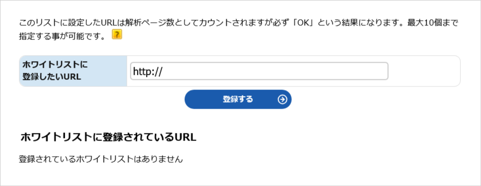 このリストに設定した URL は解析ページ数としてカウントされますが必ず「OK」という結果になります。最大 10 個まで指定することができます。