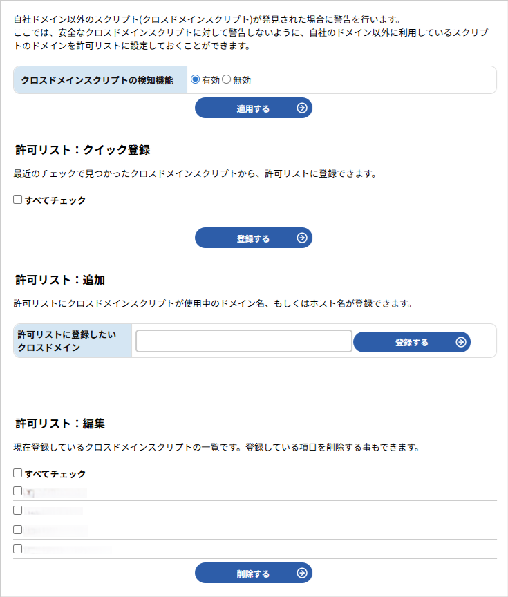 スクリプト自体を確認し、正常なものである場合には「クロスドメインの許可設定」メニューにて許可してください。