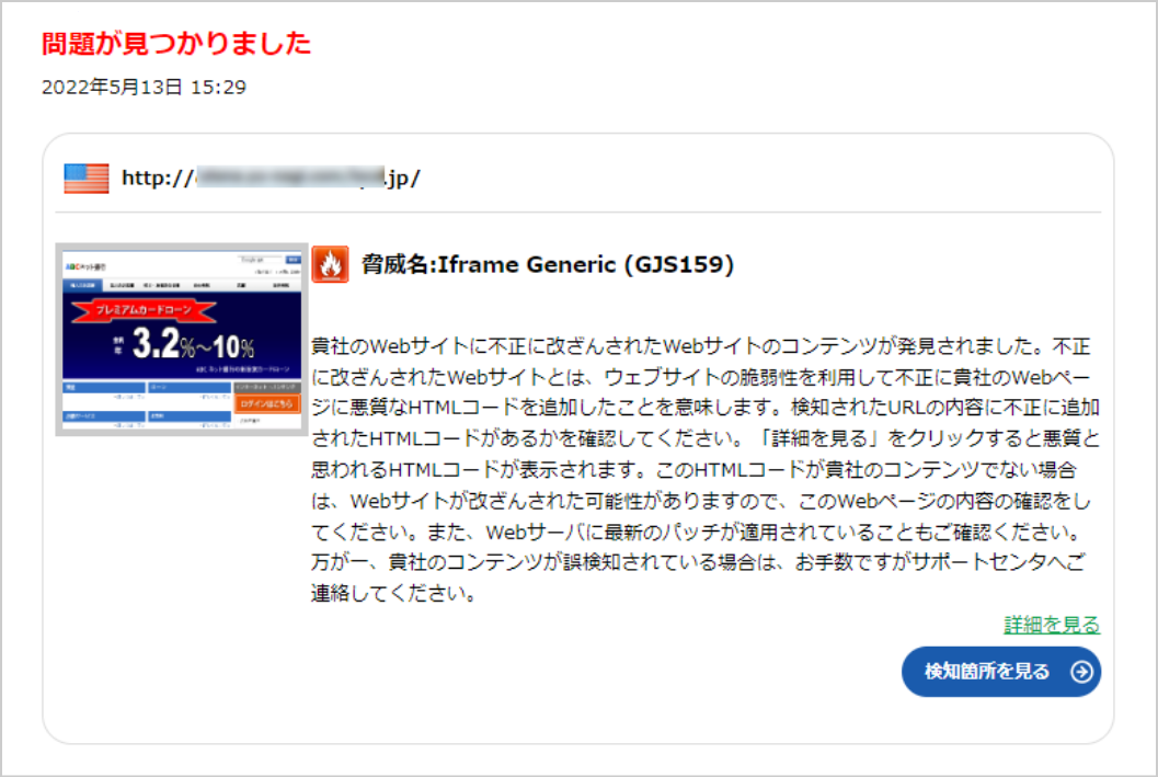 「貴社のWebサイトに不正に改ざんされたWebサイトのコンテンツが発見されました。」